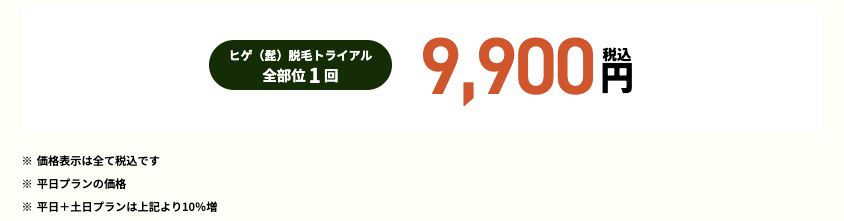 - 全身脱毛(髭、VIO込み)10回(髭をヤグレーザー、休日施術オプションあり)