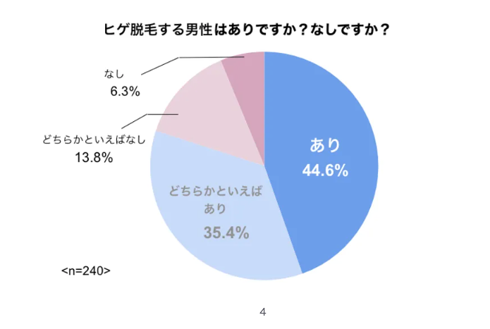 上記のアンケートは「好印象」「やや好印象」の合計が約8割と、女性が髭脱毛に対して良い印象を受けていることを示しています。