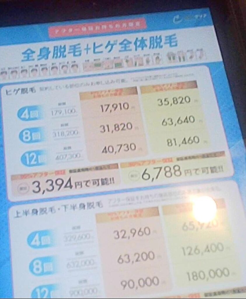 私は全身、VIOに加えて髭もまだ少し残っていたため、全身脱毛+髭+VIO全て照射を行いたいと考えていました。下記回数別の金額になります。