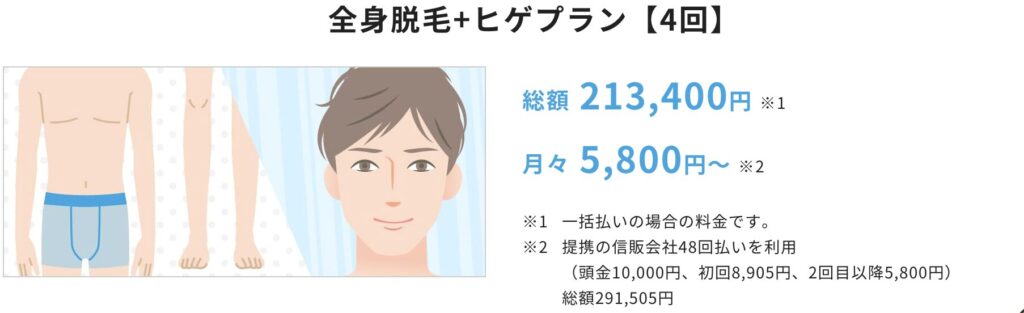 本プランはHPに記載してある通り、全身+ヒゲ+VIOを4回行えるプランです。シンプルなプランですね。