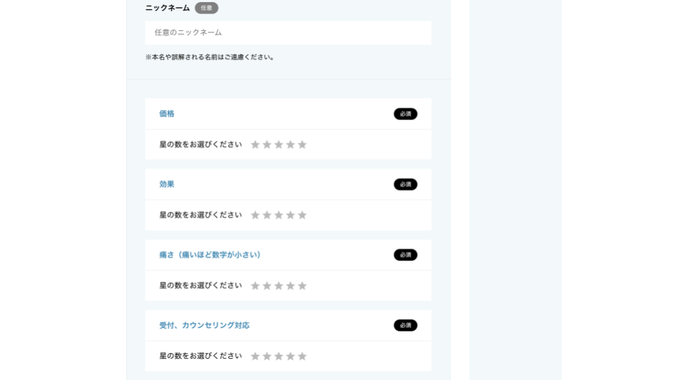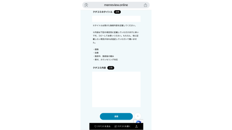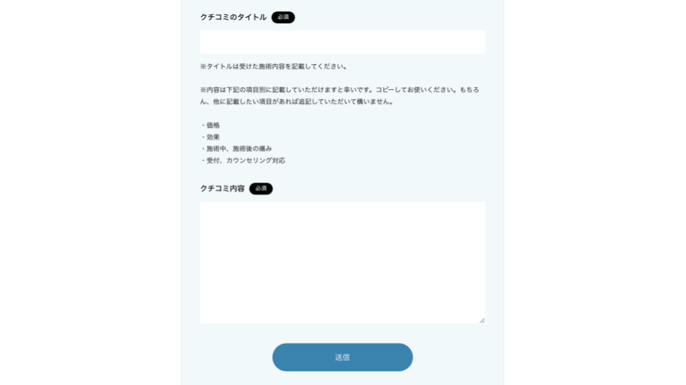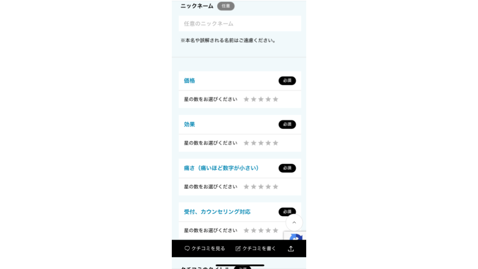 4、「ニックネーム」(任意。記載がない場合は匿名と表示されます。)「価格」「効果」「痛み」「受付、カウンセリング対応」を評価し、タイトル、クチコミを記載後、送信ボタンをタップ(クリック)します。